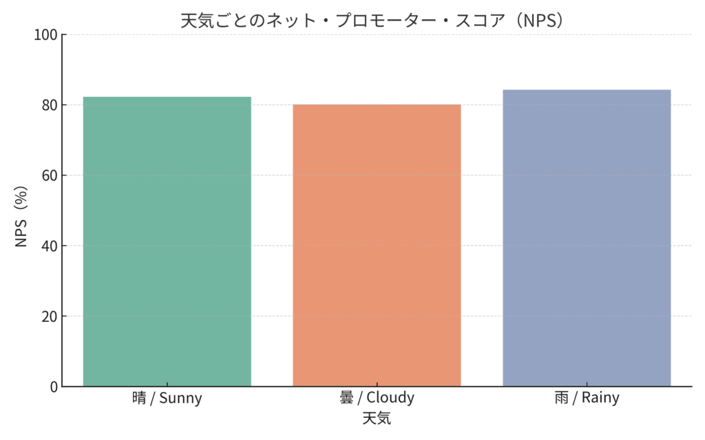 このデータと、フレンズ周辺の気象データ(気象局から取得)を日付ごとに組み合わせ、晴れの日、曇の日、雨の日の顧客満足度(ネットプロモータースコア)を算出しました。